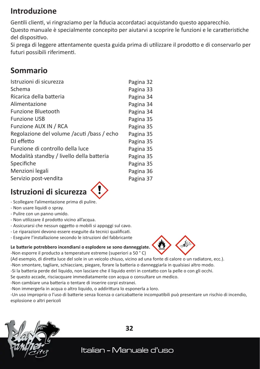 Introduzione Gentili clienti, vi ringraziamo per la fiducia accordataci acquistando questo apparecchio. Questo manuale è specialmente concepito per aiutarvi a scoprire le funzioni e le caratteristiche del dispositivo. Si prega di leggere attentamente questa guida prima di utilizzare il prodotto e di conservarlo per futuri possibili riferimenti. Sommario Istruzioni di sicurezza Pagina 32 Schema Pagina 33 Ricarica della batteria Pagina 34 Alimentazione Pagina 34 Funzione Bluetooth Pagina 34 Funzione USB Pagina 35 Funzione AUX IN / RCA Pagina 35 Regolazione del volume /acuti /bass / echo Pagina 35 DJ effetto Pagina 35 Funzione di controllo della luce Pagina 35 Modalità standby / livello della batteria Pagina 35 Specifiche Pagina 35 Menzioni legali Pagina 36 Servizio post-vendita Pagina 37 Istruzioni di sicurezza - Scollegare l'alimentazione prima di pulire. - Non usare liquidi o spray. - Pulire con un panno umido. - Non utilizzare il prodotto vicino all'acqua - Assicurarsi che nessun oggetto o mobili si appoggi sul cavo. - Le riparazioni devono essere eseguite da tecnici qualificati. - Eseguire l'installazione secondo le istruzioni del fabbricante Le batterie potrebbero incendiarsi o esplodere se sono danneggiate. a -Non esporre il producto a temperature estreme (superiori a 50 * C) {Ad esempio, di diretta luce del sole in un veicolo chiuso, vicino ad una fonte di calore o un radiatore, ecc.). -Non smontare, tagliare, schiacciare, piegare, forare la batteria o danneggiarla in qualsiasi altro modo. -Si la batteria perde del liquido, non lasciare che il liquido entri in contatto con la pelle o con gli occhi Se questo accade, risciacquare immediatamente con acqua o consultare un medico. -Non cambiare una batteria o tentare di inserire corpi estranei: -Non immergerla in acqua o altro liquido, o addirittura lo esponerla a loro. -Un uso improprio o l'uso di batterie senza licenza o caricabatterie incompatibili pud presentare un rischio di incendio, esplosione o altri pericoli Italian - Manuale d'uso