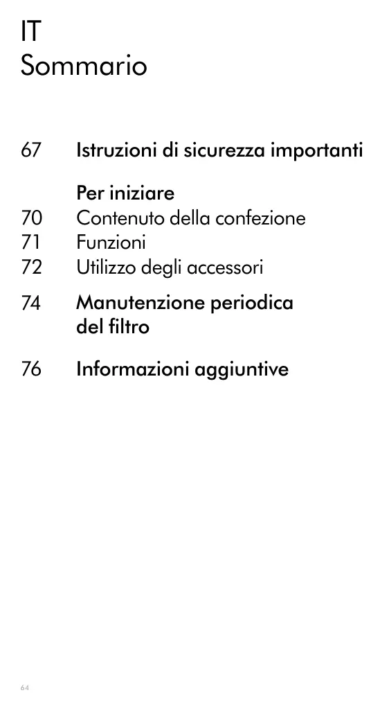 Sommario 67 Istruzioni di sicurezza importanti Per iniziare 70 Contenuto della confezione 71 Funzioni 72 Utilizzo degli accessori 74 Manutenzione periodica del filtro 76 Informazioni aggiuntive