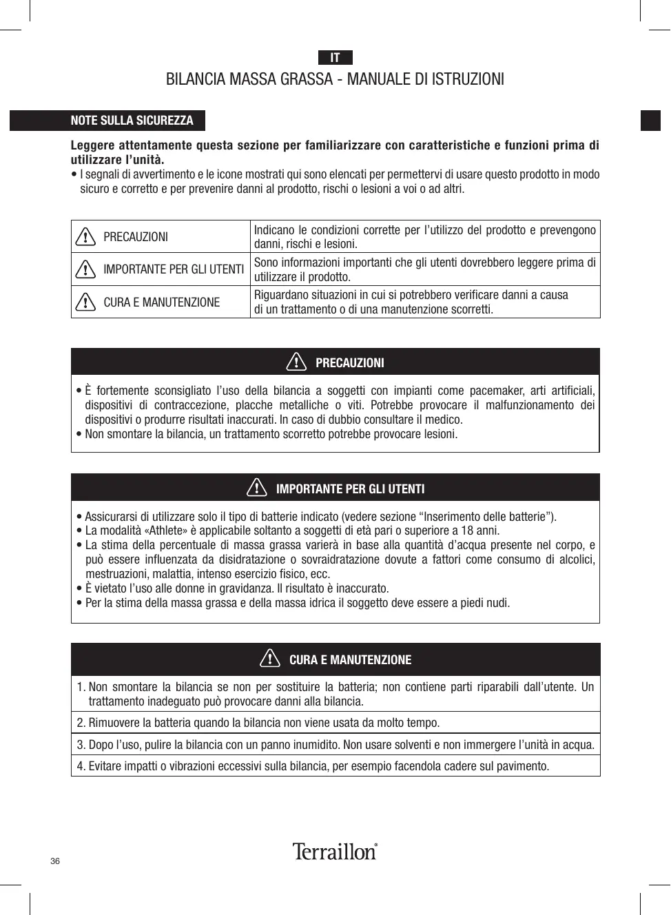 Scarica le istruzioni per il tuo Bilancia pesapersone in formato PDF gratuitamente! Trova il tuo manuale FITNESS WHITE - TERRAILLON e riprendi in mano il tuo dispositivo elettronico. In questa pagina sono pubblicati tutti i documenti necessari per l'utilizzo del tuo dispositivo. FITNESS WHITE del marchio TERRAILLON.