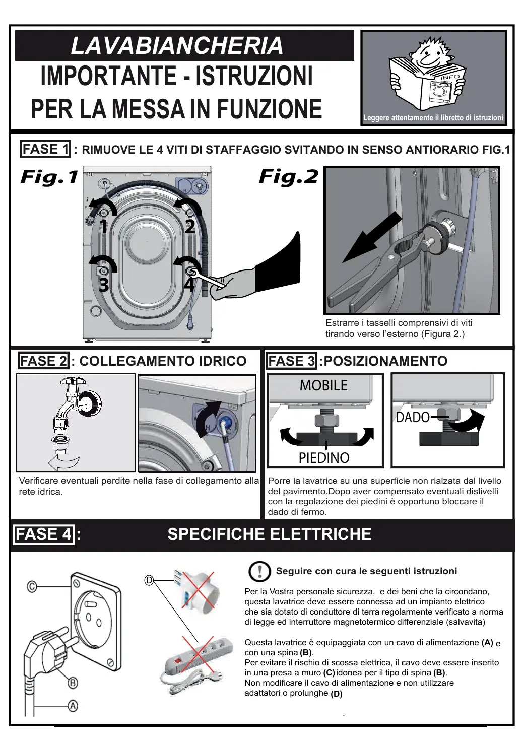 Afin d'assurer la stabilité du lave-linge, ainsi évitant de fortes vibrations pendant les cycles de lavage et essorage, il faut le placer sur une surface rigide, plane, sèche et nivelée. Pour compenser de possibles dénivellations du sol, il est possible d'intervenir sur la hauteur des pieds, en le vissant et dévissant par rapport aux exigences comme montré par la figure 4.