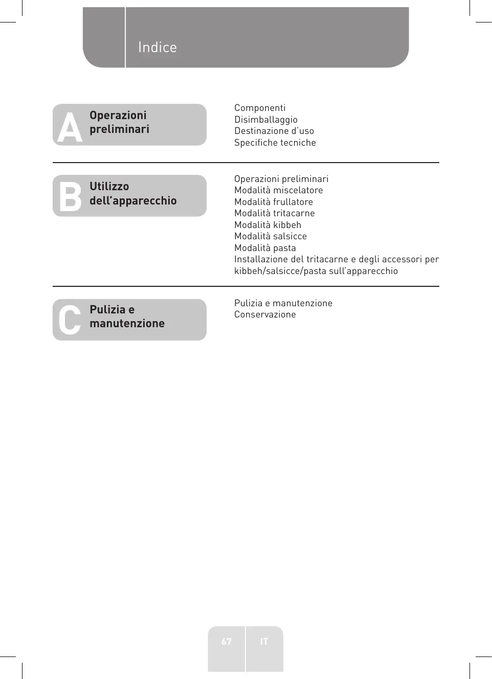 Operazioni preliminari Componenti Disimballaggio Destinazione d'uso Specifiche tecniche Utilizzo dell'apparecchio Operazioni preliminari Modalità miscelatore Modalità frullatore Modalità tritacarne Modalità kibbeh Modalità salsicce Modalità pasta Installazione del tritacarne e degli accessori per kibbeh/salsicce/pasta sull'apparecchio Pulizia e manutenzione Pulizia e manutenzione Conservazione