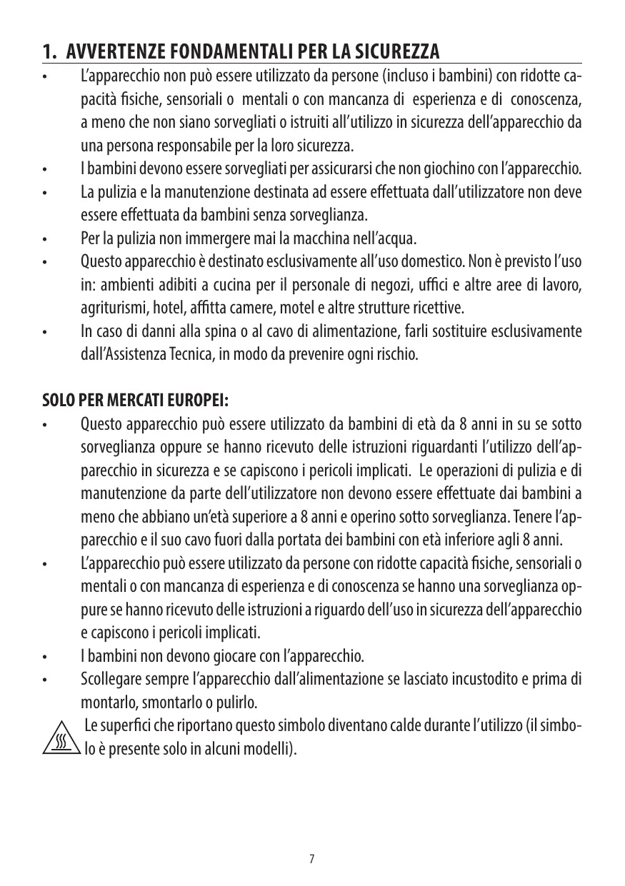 Questo apparecchio pud essere utilizzato da bambini di età da 8 anni in su se sotto sorveglianza oppure se hanno ricevuto delle istruzioni riguardanti l'utilizzo dell'ap- parecchio in sicurezza e se capiscono i pericoli implicati. Le operazioni di pulizia e di manutenzione da parte dell’utilizzatore non devono essere effettuate dai bambini a meno che abbiano un'età superiore a 8 anni e operino sotto sorveglianza. Tenere l'ap- parecchio e il suo cavo fuori dalla portata dei bambini con età inferiore agli 8 anni. L'apparecchio pud essere utilizzato da persone con ridotte capacità fisiche, sensoriali o mentali o con mancanza di esperienza e di conoscenza se hanno una sorveglianza op- pure se hanno ricevuto delle istruzioni a riguardo dell’uso in sicurezza dell'apparecchio e capiscono i pericoli implicati. l'bambini non devono giocare con l'apparecchio. Scollegare sempre l'apparecchio dall'alimentazione se lasciato incustodito e prima di montarlo, smontarlo o pulirlo. Le superfici che riportano questo simbolo diventano calde durante l’utilizzo (il simbo- lo à presente solo in alcuni modelli).