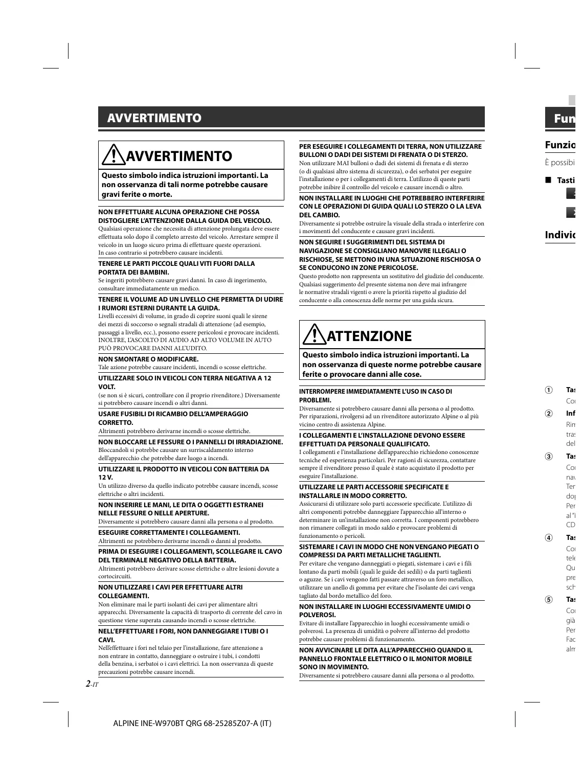 1-IT ALPINE INE-W970BT QRG 68-25285Z07-A (IT) AVVERTIMENTO AVVERTIMENTO Questo simbolo indica istruzioni importanti. La non osservanza di tali norme potrebbe causare gravi ferite o morte.