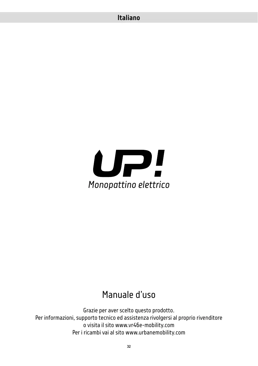 Scarica le istruzioni per il tuo Monopattino elettrico in formato PDF gratuitamente! Trova il tuo manuale VR46 - UP! e riprendi in mano il tuo dispositivo elettronico. In questa pagina sono pubblicati tutti i documenti necessari per l'utilizzo del tuo dispositivo. VR46 del marchio UP!.