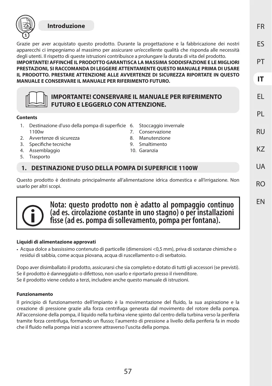 1. DESTINAZIONE D'USO DELLA POMPA DI SUPERFICIE 1100W Questo prodotto à destinato principalmente all'alimentazione idrica domestica e all'rrigazione. Non usarlo per altri scopi.