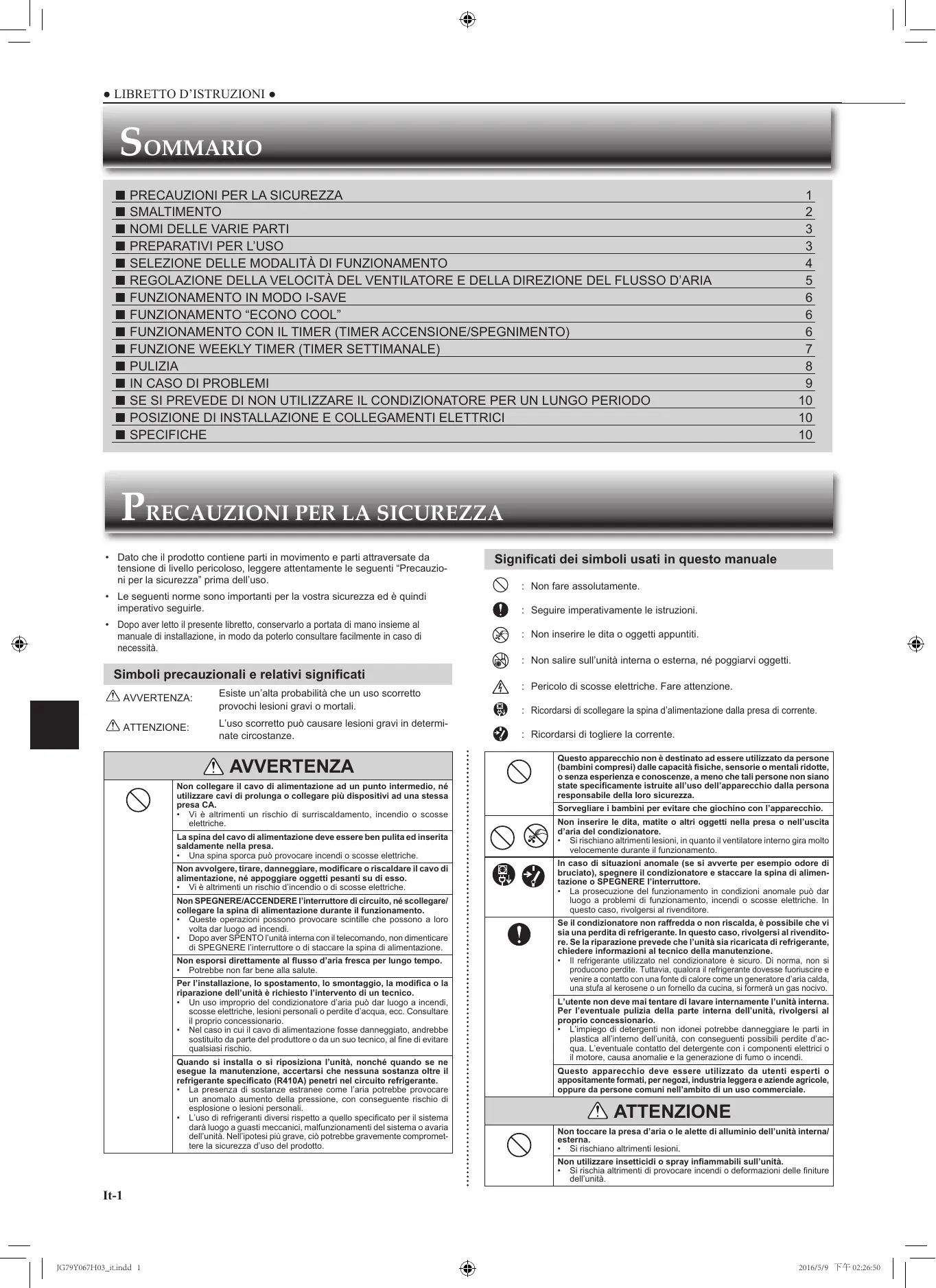 M PRECAUZIONI PER LA SICUREZZA M SMALTIMENTO M NOMI DELLE VARIE PARTI MH PREPARATIVI PER L'USO M SELEZIONE DELLE MODALITÀ DI FUNZIONAMENTO M REGOLAZIONE DELLA VELOCITÀ DEL VENTILATORE E DELLA DIREZIONE DEL FLUSSO D'ARIA M FUNZIONAMENTO IN MODO I-SAVE M FUNZIONAMENTO “ECONO COOL"