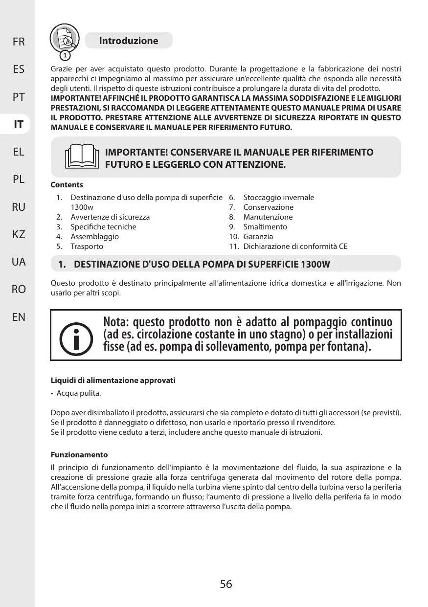 Contents 1... Destinazione d'uso della pompa di superficie 6. Stoccaggio invernale 1300w 7. Conservazione 2. Avvertenze di sicurezza 8. Manutenzione 3. Specifiche tecniche 9. Smaltimento 4. Assemblaggio 10. Garanzia 5. Trasporto 11. Dichiarazione di conformità CE