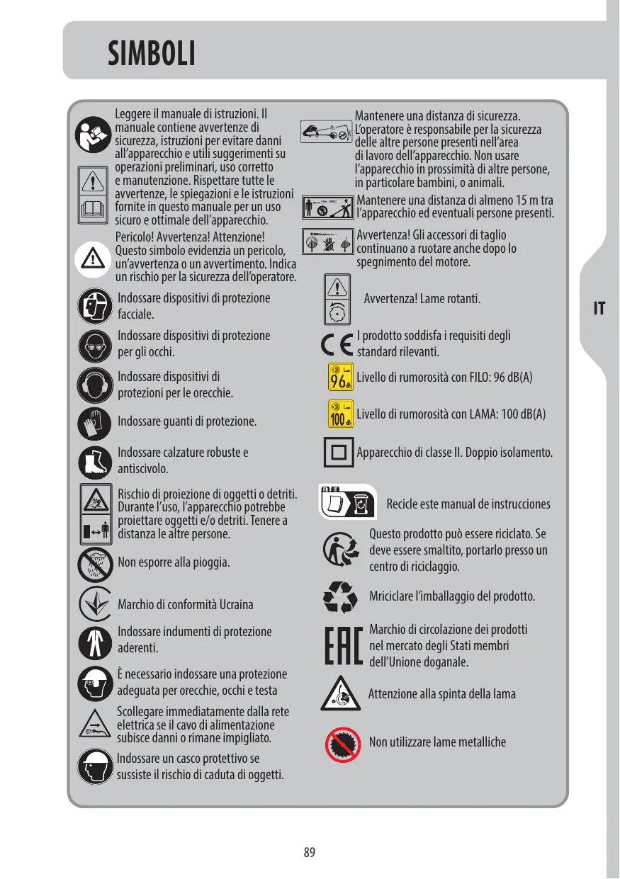 Non esporre alla pioggia. Œ Marchio di conformità Ucraina Indossare indumenti di protezione aderenti. Ë necessario indossare una protezione adeguata per orecchie, occhi e testa à Scollegare immediatamente dalla rete elettrica se il cavo di alimentazione subisce danni o rimane impigliato. € Indossare un casco protettivo se WP sussiste il rischio di caduta di oggetti. Mantenere una distanza di sicurezza. #3] Loperatore à responsabile per la sicurezza sal le altre persone presenti nell'area di lavoro dell'apparecchio. Non usare l'apparecchio in prossimità di altre persone, in particolare bambini, o animali. lantenere una distanza di almeno 15 m tra — JAvvertenzal Gli accessori di taglio ® Y #) continuano a ruotare anche dopo lo spegnimento del motore. Avvertenza! Lame rotanti.
