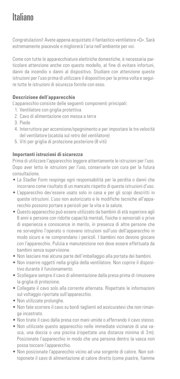Importanti istruzioni di sicurezza Prima di utilizzare l'apparecchio leggere attentamente le istruzioni per l'uso. Dopo aver letto le istruzioni per l'uso, conservarle con cura per la futura consultazione + La Stadler Form respinge ogni responsabilità per la perdita o danni che incorrano come risultato di un mancato rispetto di queste istruzioni d'uso L'apparecchio dev'essere usato solo in casa e per gli scopi descritti in queste istruzioni. L'uso non autorizzato e le modifiche tecniche all'appa- recchio possono portare a pericoli per la vita e la salute. Questo apparecchio puè essere utilizzato da bambini di età superiore agli 8 anni e persone con ridotte capacità mentali, fisiche o sensoriali o prive di esperienza e conoscenze in merito, in presenza di altre persone che ne sorveglino l'operato o ricevano istruzioni sull'uso dell'apparecchio in modo sicuro 8 ne comprendano i pericoli. | bambini non devono giocare con l'apparecchio. Pulizia e manutenzione non deve essere effettuata da bambini senza supervisione. Non lasciare mai alcuna parte dell'imballaggio alla portata dei bambini Non inserire aggetti nella griglia della ventilatore. Non coprire il disposi- tivo durante il funzionamento. Scollegare sempre il cavo di alimentazione dalla presa prima di rimuovere la griglia di protezione. Collegate il cavo solo alla corrente alternata. Rispettate le informazioni sul voltaggio riportate sull'apparecchio Non utilizzate prolunghe. Non fate scorrere il cavo su bordi taglienti ed assicuratevi che non riman- ga incastrato. Non tirate il cavo dalla presa con mani umide o afferrando il cavo stesso. Non utilizzate questo apparecchio nelle immediate vicinanze di una va- sca, una doccia o una piscina (rispettate una distanza minima di 3m) Posizionate l'apparecchio in modo che una persona dentro la vasca non possa toccare l'apparecchio. Non posizionate l'apparecchio vicino ad una sorgente di calore. Non sot- toponete il cavo di alimentazione al calore diretto (come piastre, fiamme
