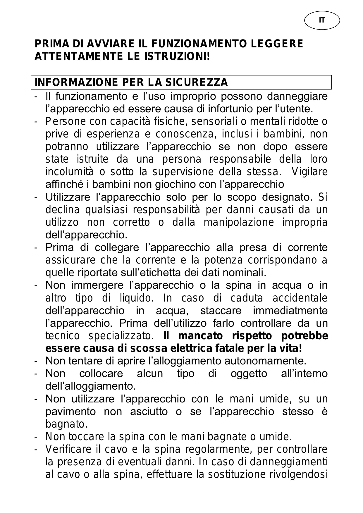 - Îl funzionamento e l’uso improprio possono danneggiare l'apparecchio ed essere causa di infortunio per l’utente. - Persone con capacità fisiche, sensoriali o mentali ridotte o prive di esperienza e conoscenza, inclusi i bambini, non potranno utilizzare l’apparecchio se non dopo essere state istruite da una persona responsabile della loro incolumità o sotto la supervisione della stessa. Vigilare affinché i bambini non giochino con l’apparecchio - Utilizzare l’apparecchio solo per lo scopo designato. Si declina qualsiasi responsabilità per danni causati da un utilizzo non corretto o dalla manipolazione impropria dell'apparecchio. - Prima di collegare l’apparecchio alla presa di corrente assicurare che la corrente e la potenza corrispondano à quelle riportate sull'etichetta dei dati nominal. - Non immergere l’apparecchio o la spina in acqua o in altro tipo di liquido. In caso di caduta accidentale dell'apparecchio in acqua, staccare immediatmente lapparecchio. Prima dellutilizzo farlo controllare da un tecnico specializzato. Il mancato rispetto potrebbe essere causa di scossa elettrica fatale per la vita! - Non tentare di aprire l’alloggiamento autonomamente. - Non collocare alcun tipo di oggetto allinterno dellalloggiamento. - Non utilizzare l’'apparecchio con le mani umide, su un pavimento non asciutto o se l'apparecchio stesso à bagnato. - Non toccare la spina con le mani bagnate o umide. - Verificare il cavo e la spina regolarmente, per controllare là presenza di eventuali danni. In caso di danneggiamenti al cavo o alla spina, effettuare la sostituzione rivolgendosi