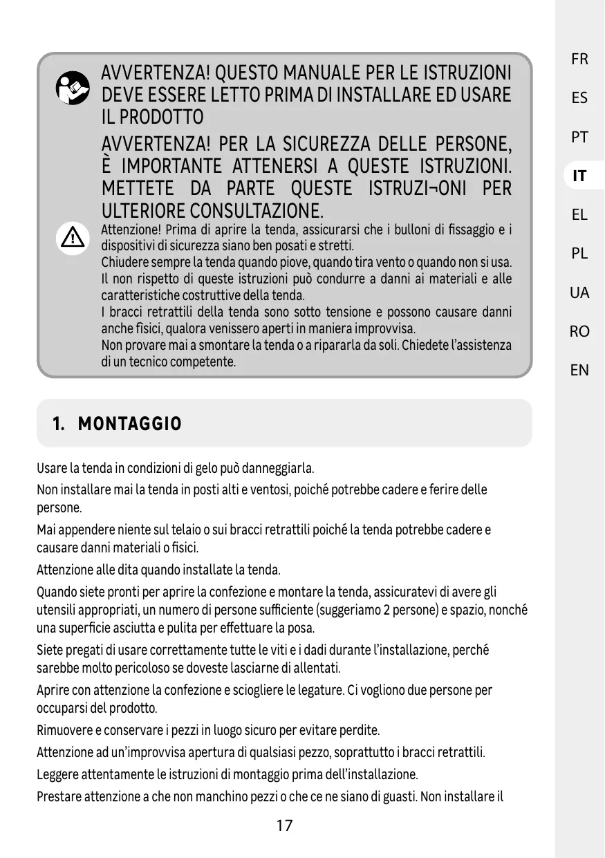 VAN Avant d'ouvrir Le store banne vous devez être sûr que les fixations et les éléments de sécurité ont été installés de façon correcte. Vous devez toujours fermer votre store banne quand Le vent souffle, durant une averse et quand vous n’en avez pas l'usage. Ne pas respecter ces consignes pourrait provoquer des dommages matériels et structurels. Les bras du store banne sont tendus et peuvent provoquer en cas d'ouverture brutale, des blessures et des dommages. Ne jamais essayer de démonter ou de réparer vous-même ce store banne. Faites appel à un technicien qualifié.