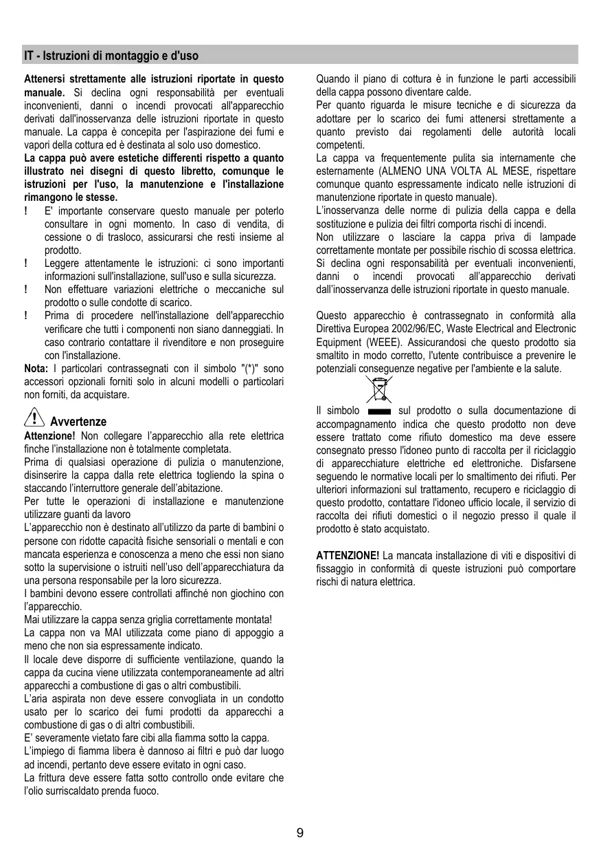 Attenersi strettamente alle istruzioni riportate in questo manuale. Si declna ogni responsabiità per eventuali inconvenienti, danni_o_ incendi_provocati_all'apparecchio derivati dal'inosservanza delle istruzioni riportate in questo menuale. La cappa à concepita per l'aspirazione dei fumi e vapor della cottura ed à destinata al solo uso domestico.