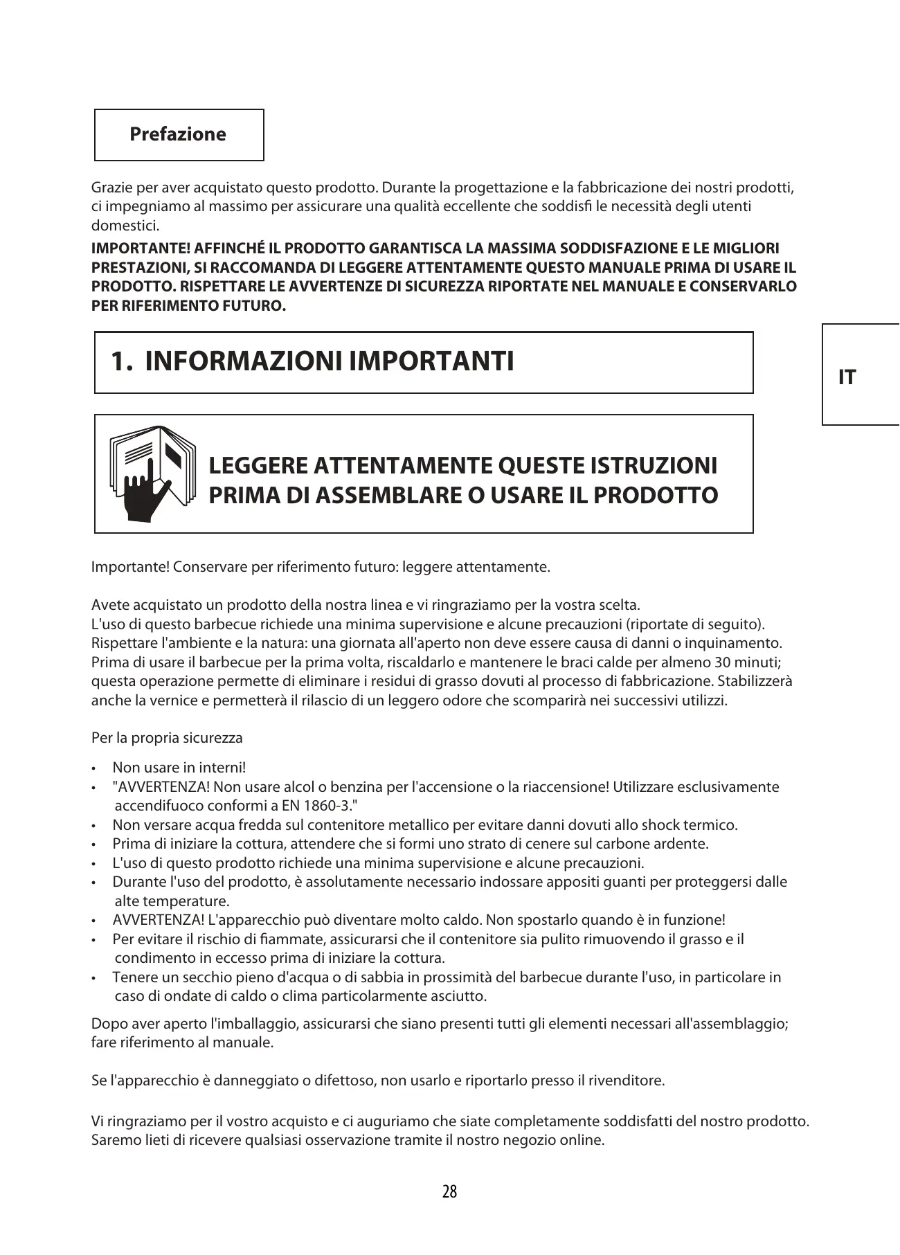 L'uso di questo barbecue richiede una minima supervisione e alcune precauzioni (riportate di seguito). Rispettare l'ambiente e la natura: una giornata all'aperto non deve essere causa di danni o inquinamento. Prima di usare il barbecue per la prima volta, riscaldarlo e mantenere le braci calde per almeno 30 minuti; questa operazione permette di eliminare i residui di grasso dovuti al processo di fabbricazione. Stabilizzerà anche la vernice e permetterà il rilascio di un leggero odore che scomparirà nei successivi utilizzi.