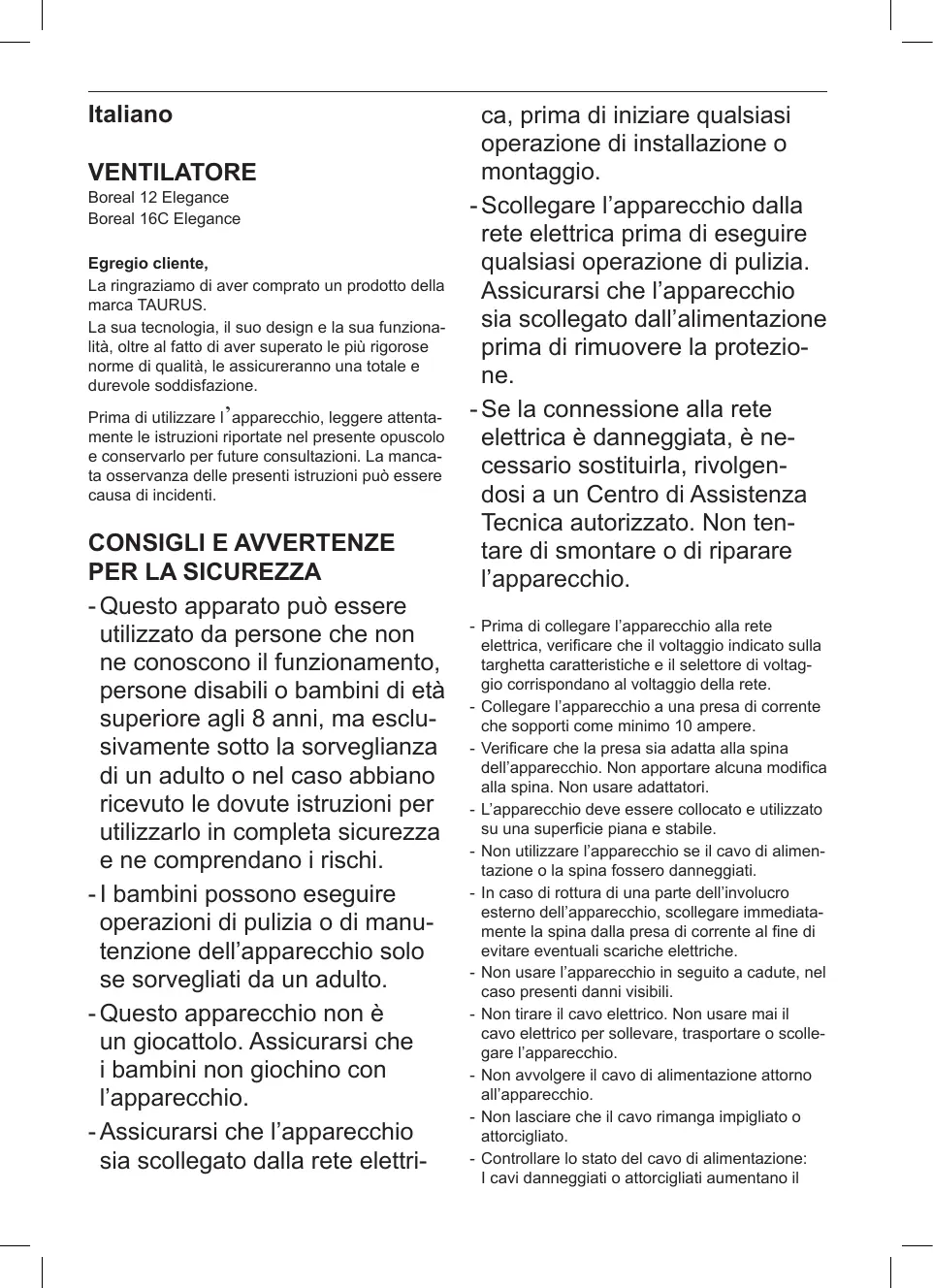 BOREAL 16C ELEGANCE - Ventilatore TAURUS - Manuale utente e istruzioni gratuiti