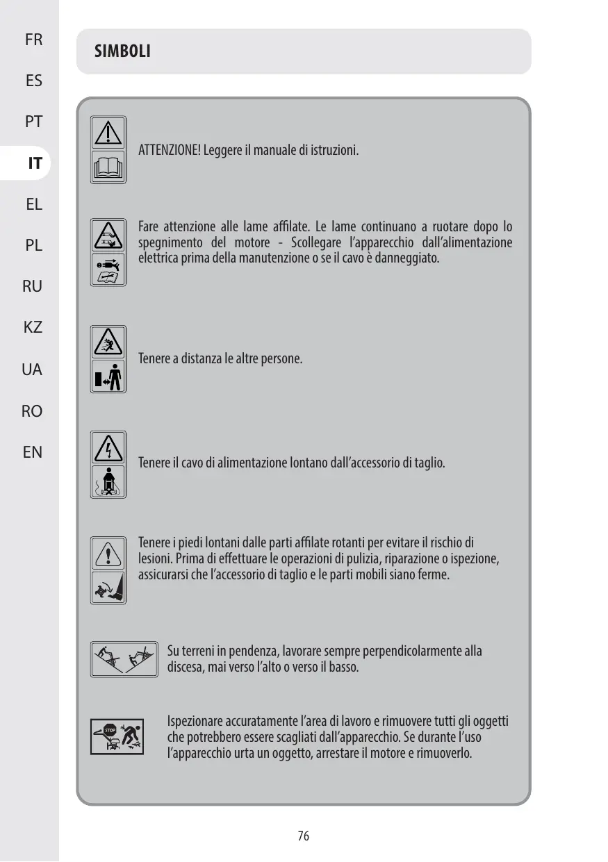 + Démarrez le moteur prudemment, de la manière indiquée dans le mode d'emploi, et avec les pieds à une distance raisonnable des lames.