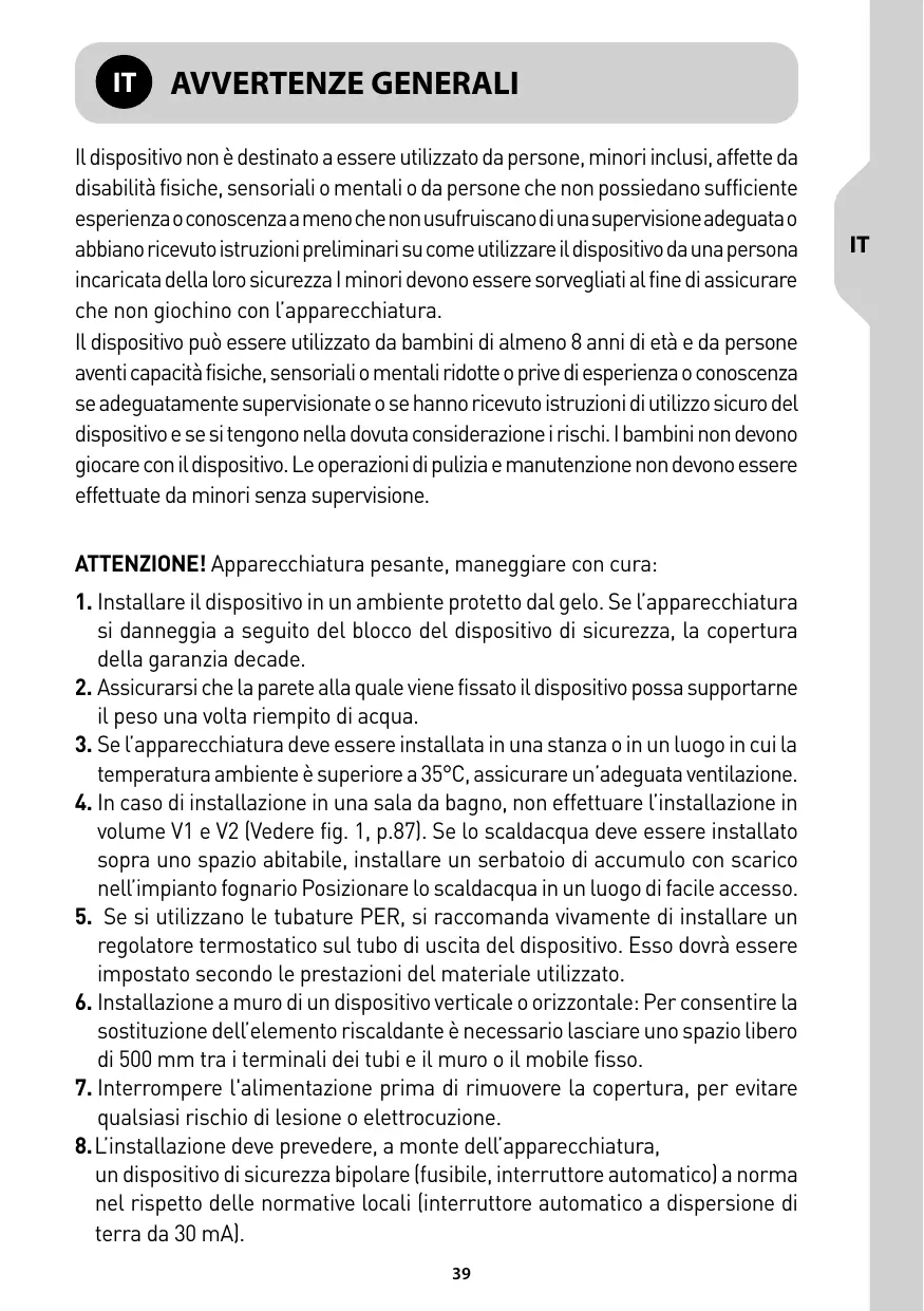 © Av vERTENZE GENERAL ILdispositivo non à destinato a essere utilizzato da persone, minori inclusi, affette da disabilità fisiche, sensoriali o mentali o da persone che non possiedano sufficiente esperienza o conoscenza a meno che nonusufruiscano diunasupervisione adeguata o abbianoricevuto istruzioni preliminari su come utilizzare il dispositivo da una persona incaricata della loro sicurezza | minori devono essere sorvegliati al fine di assicurare che non giochino con l'apparecchiatura. IL dispositivo pud essere utilizzato da bambini di almeno 8 anni di età e da persone aventi capacità fisiche, sensoriali o mentali ridotte o prive di esperienza o conoscenza se adeguatamente supervisionate o se hanno ricevuto istruzioni di utilizzo sicuro del dispositivo e se sitengono nella dovuta considerazione i rischi. | bambini non devono giocare conil dispositivo. Le operazioni di pulizia e manutenzione non devono essere effettuate da minori senza supervisione. ATTENZIONE! Apparecchiatura pesante, maneggiare con cura: