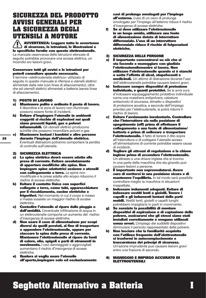 AVERTISSEMENTS DE SÉCURITÉ POUR SCIE SABRE Tenir l'outil par les zones de prises isolées lors d'une utilisation où l'outil tranchant pourrait entrer en contact avec des fils cachés. l'accessoire de coupe, s'il entre en contact avec un fil “sous tension’ peut mettre les parties métalliques exposées de l'outil “sous tension” et électrocuter l'opérateur.