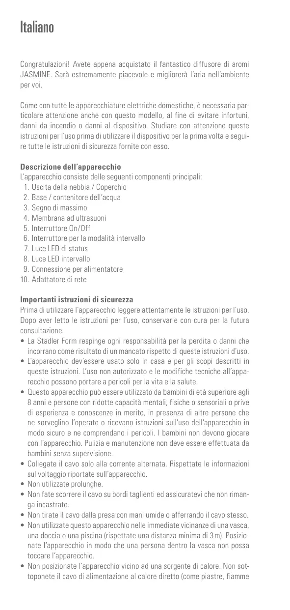 Scarica le istruzioni per il tuo Diffusore di oli essenziali in formato PDF gratuitamente! Trova il tuo manuale JASMINE TITANIUM - STADLERFORM e riprendi in mano il tuo dispositivo elettronico. In questa pagina sono pubblicati tutti i documenti necessari per l'utilizzo del tuo dispositivo. JASMINE TITANIUM del marchio STADLERFORM.