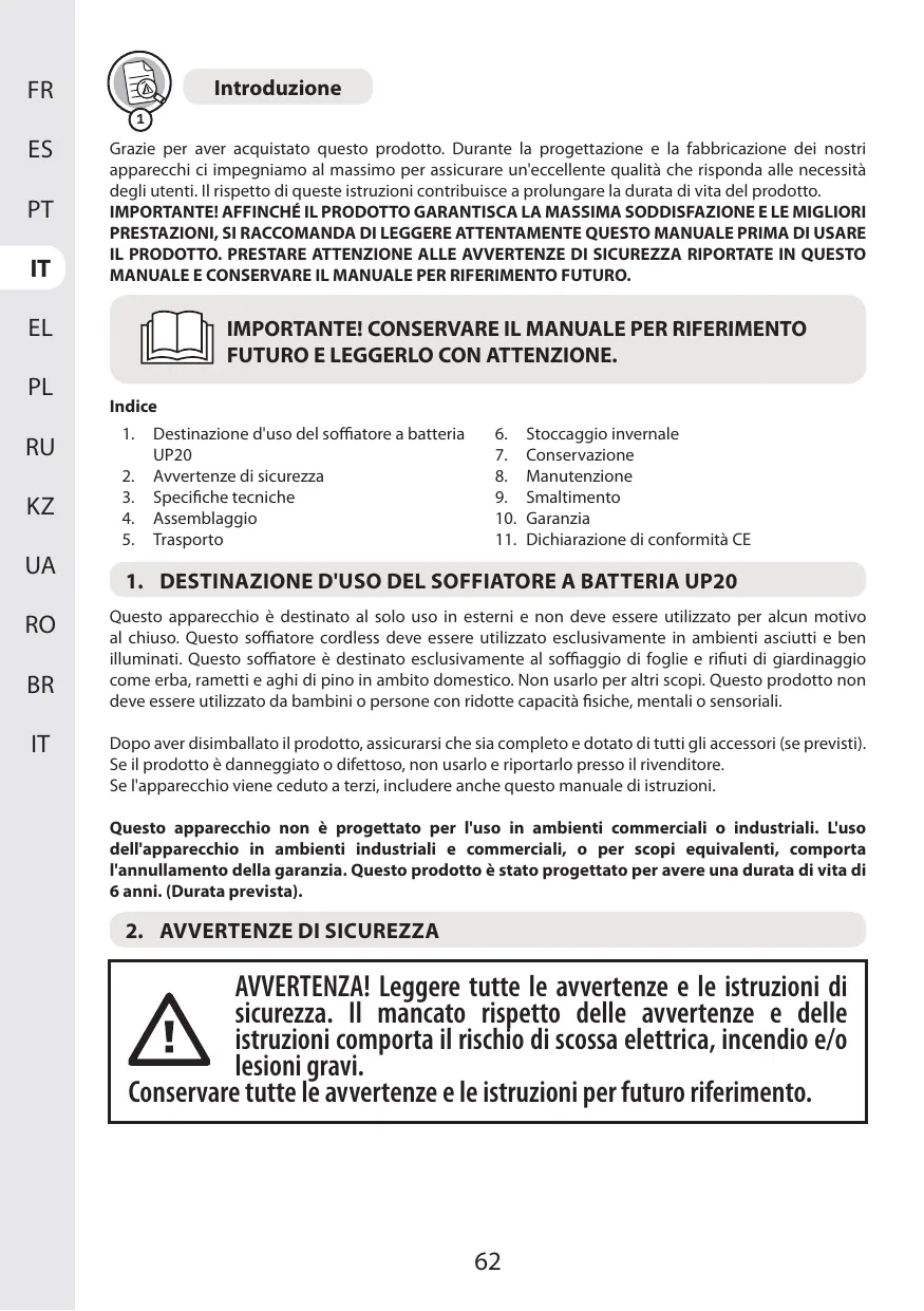1. Destinazione d'uso del soffiatore a batteria 6. Stoccaggio invemale UP20 7. Conservazione Awvertenze di sicurezza 8. Manutenzione Specifiche tecniche 9. Smaltimento Assemblaggio 10. Garanzia Trasporto 11. Dichiarazione di conformità CE