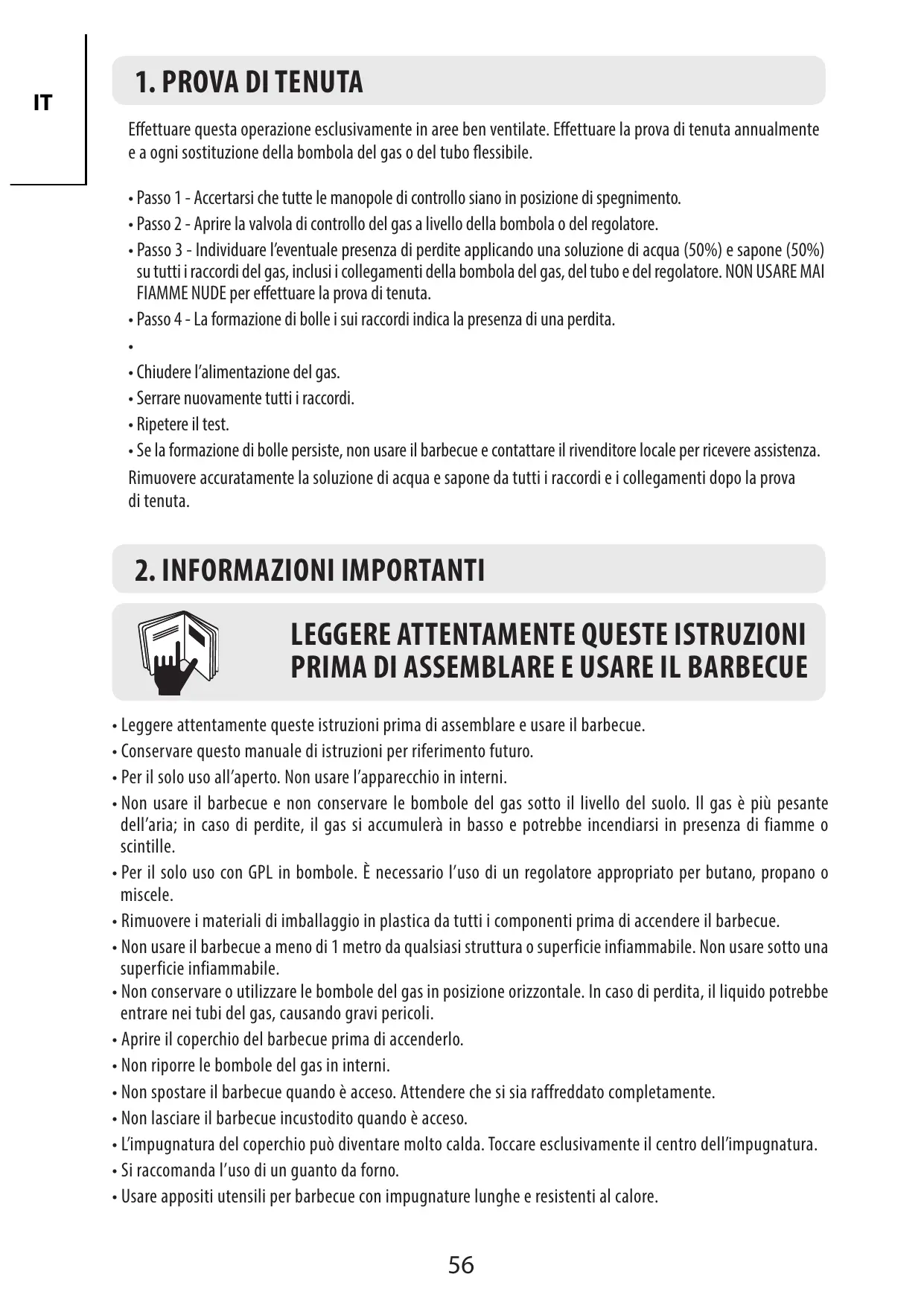 2. INFORMAZIONI IMPORTANTI LEGGERE ATTENTAMENTE QUESTE ISTRUZIONI PRIMA DI ASSEMBLARE E USARE IL BARBECUE