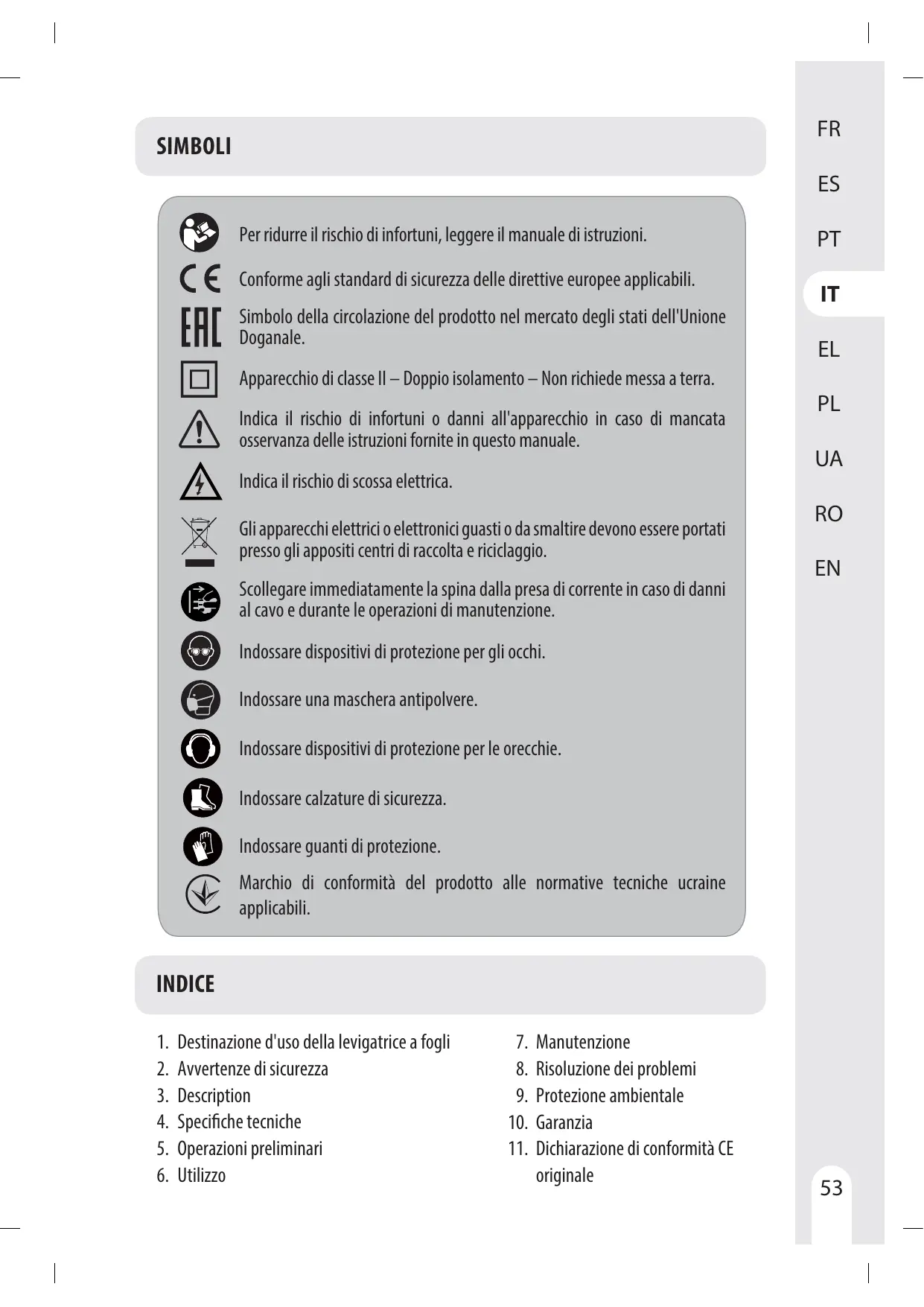 électrique. En cas de dommages, faire réparer l'outil électrique avant de IT l'utiliser. De nombreux accidents sont dus à des outils électriques mal entretenus. f) Garder affûtés et propres les outils permettant de couper. Des outils destinés à EL couper correctement entretenus avec des pièces coupantes tranchantes sont moins susceptibles de bloquer et sont plus faciles à contrôler. PL g) Utiliser l'outil électrique, les accessoires et les lames etc., conformément à ces instructions, en tenant compte des conditions de travail et du travail à UA réaliser. L'utilisation de l'outil électrique pour des opérations différentes de celles prévues peut donner lieu à des situations dangereuses. RO h) Il faut que les poignées et les surfaces de préhension restent sèches, propres et dépourvues d'huiles et de graisses. Des poignées et des surfaces de préhension EN