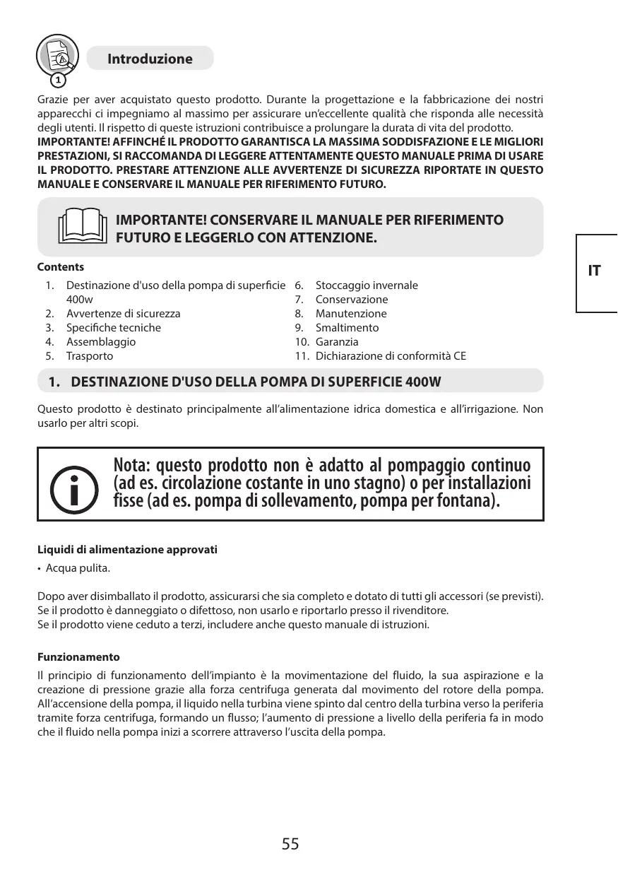 Contents 1. Destinazione d'uso della pompa di superficie 6. _ Stoccaggio invernale 400w 7. Conservazione 2. Avvertenze di sicurezza 8. Manutenzione 3. Specifiche tecniche 9. Smaltimento 4. Assemblaggio 10. Garanzia 5. Trasporto 11. Dichiarazione di conformità CE