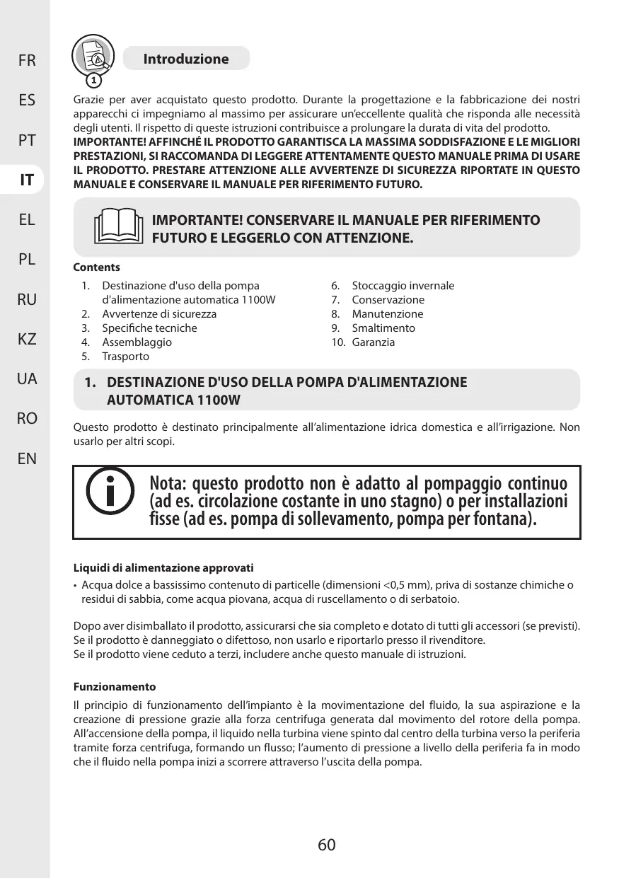1. Utilisation prévue de la pompe d'alimentation automatique 1100W 7. Rangement (le cas échéant). Si le produit est endommagé ou présente un défaut, ne l'utilisez pas et retournez-le à votre revendeur.