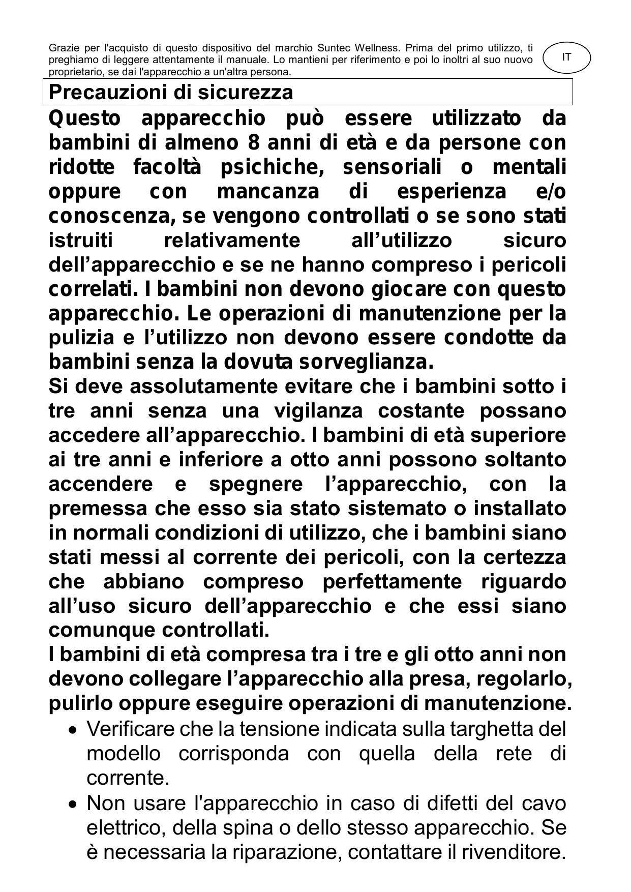 En caso de que necesite asistencia técnica, péngase en contacto con su distribuidor especializado. Denominacién del producto: Nümero de serie: Nombre del comprador: Fecha de compra: Sello y firma del distribuidor especializado: Fabricante: Nous nous engageons de remettre en état votre appareil gratuitement pendant la période de garantie de 24 mois ou alors de mettre à disposition les pièces détachées gratuitement à votre commerçant spécialisé, si votre appareil devait défaillir en raison d'une erreur de fabrication ou d'un vice de matériel côté production. Toute revendication à notre encontre allant au-delà est exclue. Nous n’assumons pas de responsabilité pour des endommagements dans des cas de force majeure, en cas de manipulation incorrecte, en cas de non-respect de la notice, en cas d'usure due au fonctionnement ou pour des dommages survenus sur le chemin du transport. Ce certificat est uniquement valable avec la facture correspondante. En cas d'intervention de service, veuillez ramener le produit acheté à votre commerçant spécialisé. Désignation de l’article : Numéro de série : Nom de l'acheteur : Date de l’achat : Cachet et signature du commerçant spécialisé : Fabricant : Suntec Wellness GmbH HolzstraRe 2