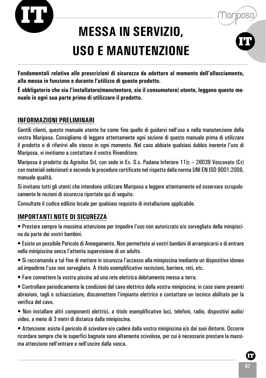 Mariposa est un produit Agrisilos Srl, dont le siège est dans l'Ex. S.s. Padana Inferiore 11/c - 26039 Ves- covato (Cr) avec des matériaux sélectionnés et selon des procédures certifiées conformes à la norme UNI EN 1S0 9001:2008, manuel qualité.