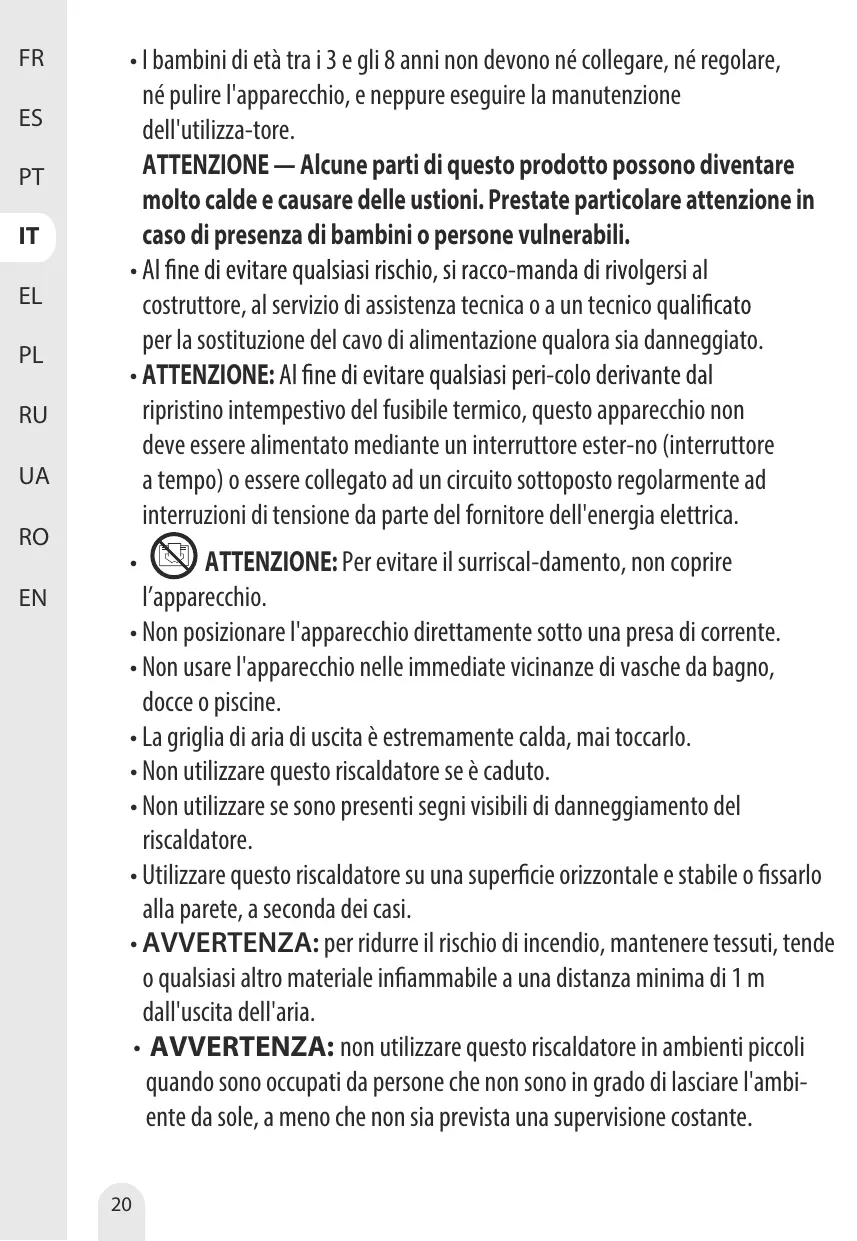 - L'appareil de chauffage ne doit pas être placé juste en dessous d'une prise de courant.