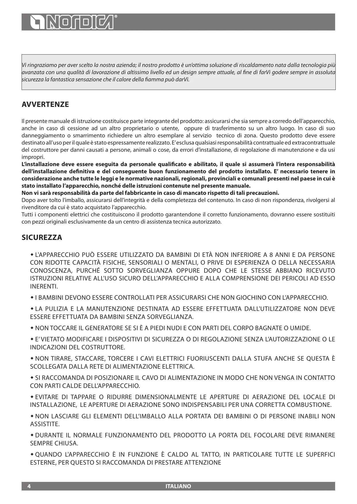 AVERTISSEMENTS GENERAUX La responsabilité de La société La NORDICA S.p.a. se limite à la fourniture de l'appareil.
