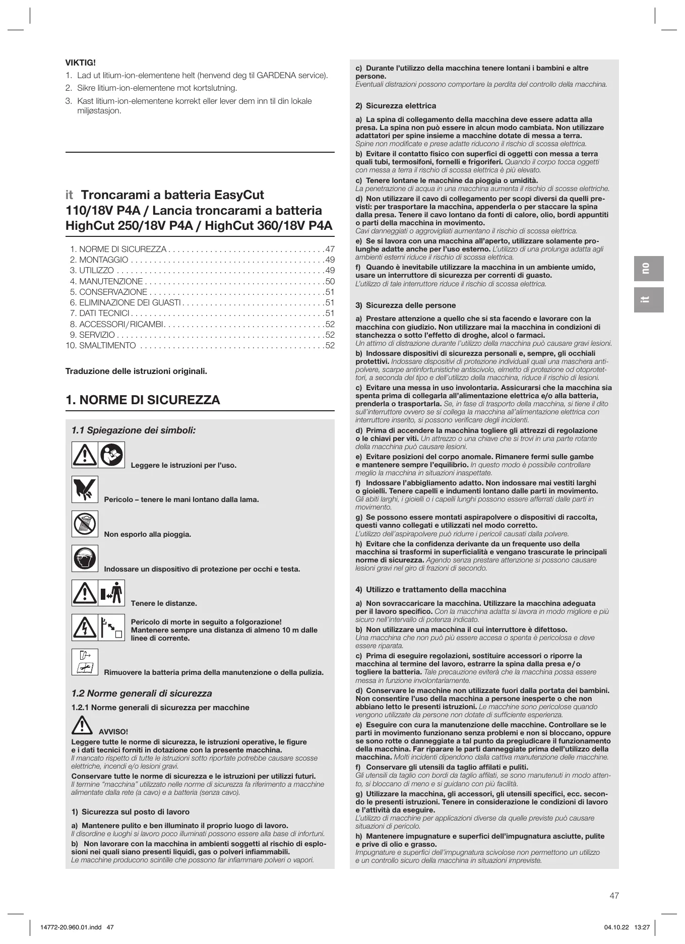 MANUALE UTENTE EasyCut 110/18V P4A, HighCut 250/18V P4A, HighCut 360/18V P4A GARDENA