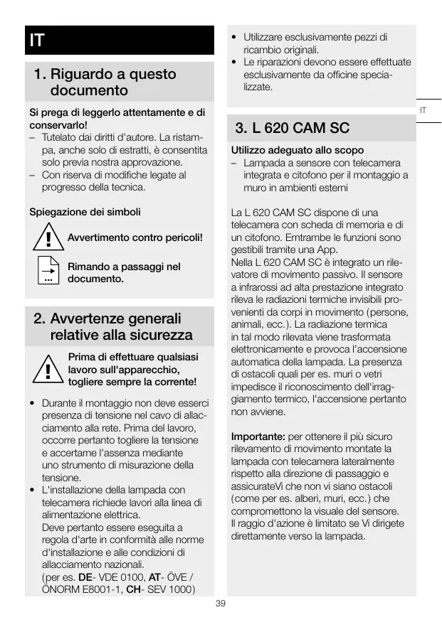 Avant toute intervention sur L'installation de l'applique avec caméra implique une intervention sur le réseau électrique et doit donc être effectuée correctement et conformément à la nomme NF C-15100. (Par ex. DE - VDE 0100, AT - ÔVE / NORM E8001-1, CH - SEV 1000) Utiser uniquement des pièces de: rechange d'origine. Les réparations ne doivent être effec- tuées que par des ateliers spécialisés.