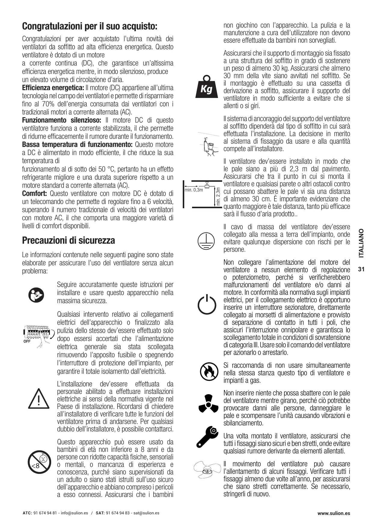 Sulion garantisce il corretto funzionamento delle appa- recchiature e le eventuali riparazioni o forniture di pezzi di ricambio in caso di difetti di fabbricazione fino a 3 anni dalla data di vendita. Questa garanzia à di 5 anni per i diodi LED e 8 anni per il motore della vento- la CC. Sulion non è responsabile per un uso improprio.