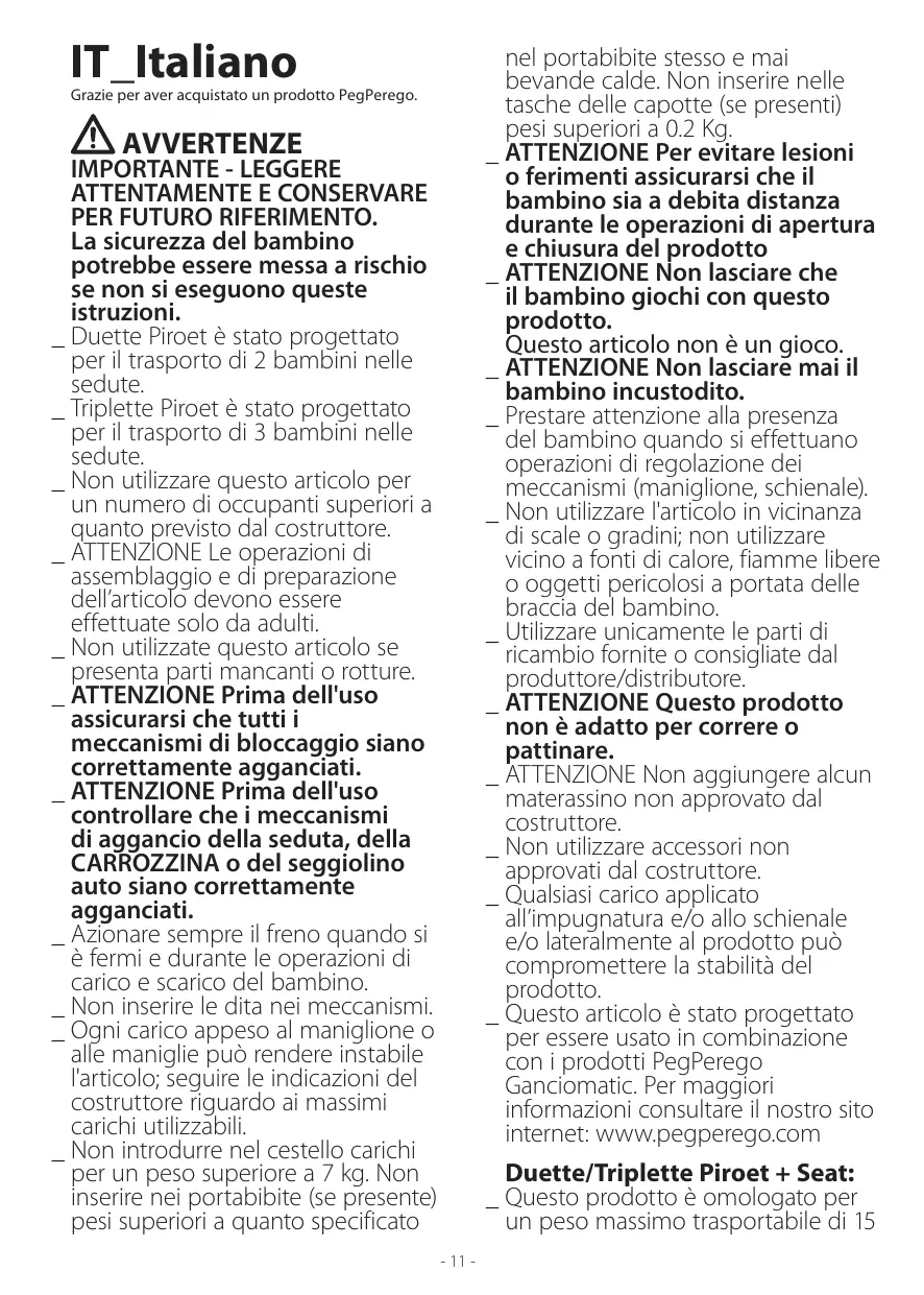 DUETTE PIROET - Poussettes doubles PEG PEREGO - Manuale utente e istruzioni gratuiti