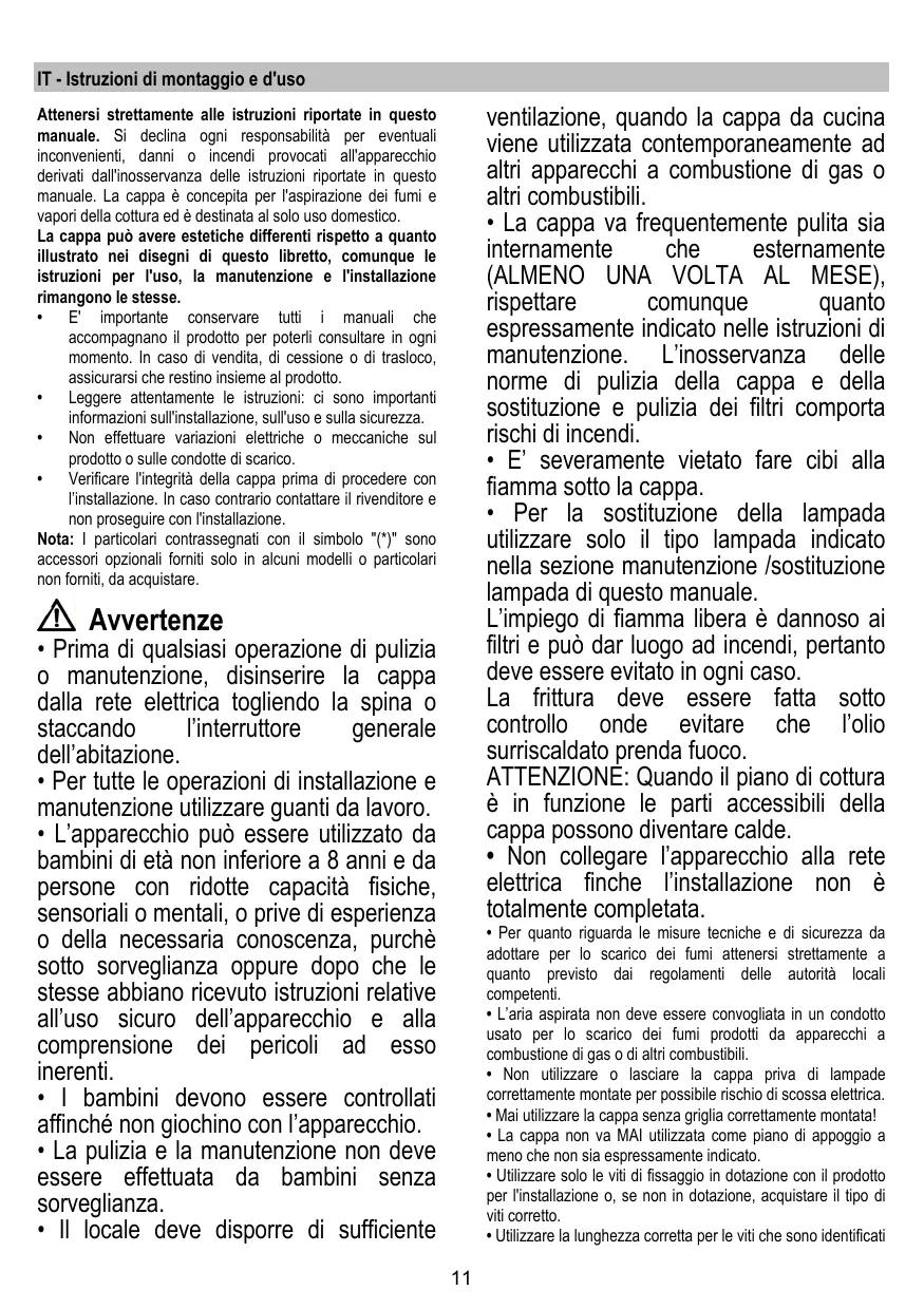 Attenersi strettamente alle istruzioni riportate in questo manuale. Si declna ogni responsabiità per eventuali inconvenienti, danni_o_ incendi_provocati_all'apparecchio derivati dal'inosservanza delle istruzioni riportate in questo menuale. La cappa à concepita per l'aspirazione dei fumi e vapor della cottura ed à destinata al solo uso domestico.
