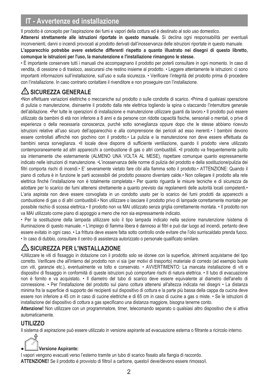 -Ne pas effectuer de variations électriques ou mécaniques sur le produit ou sur les conduits d'évacuation. +Avant toute opération de nettoyage où d'entretien, débrancher le produit du secteur électrique en enlevant la fiche ou à travers le disjoncteur général du logement. “Utiliser des gants de travail pour toutes les opérations d'installation et d'entretien.» Le produit peut être utlisé par des enfants âgés d'au moins 8 ans et par des personnes ayant des capacités physiques, sensorielles ou mentales réduites ou sans expérience ou sans les connaissances nécessaires, à condition qu'ils soient surveillés ou après que ces personnes aient reçu des instructions relatives à l'usage sûr de l'appareil et à la compréhension des dangers afférents.+ Les enfants doivent être contrôlés fn qu'ls ne jouent pas avec le produit Le nettoyage et l'entretien ne doivent pas être effectués par des enfants sans surveillance. Le local doit disposer d'une ventilation suffisante lorsque le produit est utlisé en même temps que d'autres appareils à combustion de gaz ou autres combustibles. Le produit doit être fréquemment nettoyé, à l'intérieur comme à l'extérieur (AU MOINS UNE FOIS PAR MOIS) ; respecter dans tous les cas les indications présentes dans les instructions d'entretien. Le non-respect des normes de nettoyage du produit et du remplacement/nettoyage des flres comporte des risques d'incendie. Il est