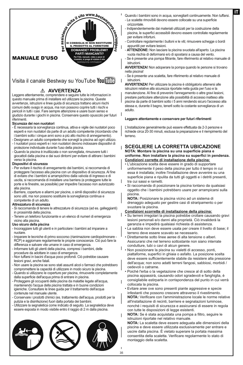 Scarica le istruzioni per il tuo Piscine hors-sol in formato PDF gratuitamente! Trova il tuo manuale STEEL PRO - BESTWAY e riprendi in mano il tuo dispositivo elettronico. In questa pagina sono pubblicati tutti i documenti necessari per l'utilizzo del tuo dispositivo. STEEL PRO del marchio BESTWAY.