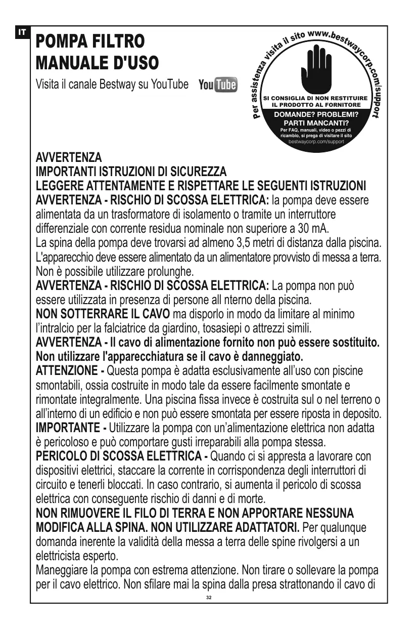 ATTENZIONE - Questa pompa è adatta esclusivamente all'uso con piscine smontabili, ossia costruite in modo tale da essere facilmente smontate e rimontate integralmente. Una piscina fissa invece à costruita sul o nel terreno o all'intemo di un edificio e non pud essere smontata per essere riposta in deposito. IMPORTANTE - Ufilizzare la pompa con un'alimentazione elettrica non adatta è pericoloso e puù comportare gusti irreparabili alla pompa stessa.