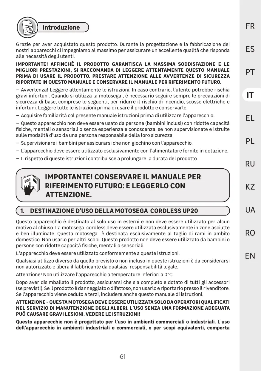 (e DESTINAZIONE D'USO DELLA MOTOSEGA CORDLESS UP20 )