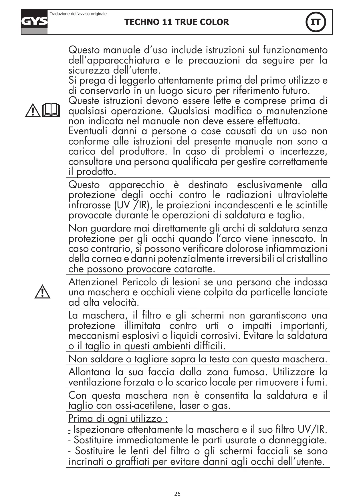 Scarica le istruzioni per il tuo Masque de soudeur in formato PDF gratuitamente! Trova il tuo manuale TECHNO 11 TRUE COLOR - GYS e riprendi in mano il tuo dispositivo elettronico. In questa pagina sono pubblicati tutti i documenti necessari per l'utilizzo del tuo dispositivo. TECHNO 11 TRUE COLOR del marchio GYS.