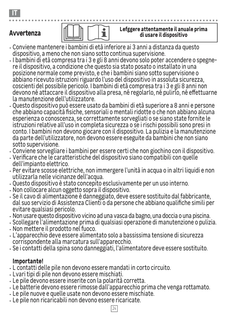 + Questo dispositivo puû essere usato da bambini di età superiore a 8 anni e persone che abbiano capacità fisiche, sensoriali o mentali ridotte o che non abbiano alcuna esperienza o conoscenza, se correttamente sorvegliati o se siano state fornite Le istruzioni relative all'uso in completa sicurezza o se i rischi possibili sono presi in conto. | bambini non devono giocare con il dispositivo. La pulizia e La manutenzione da parte dell'utilizzatore, non devono essere eseguite da bambini che non siano sotto supervisione.