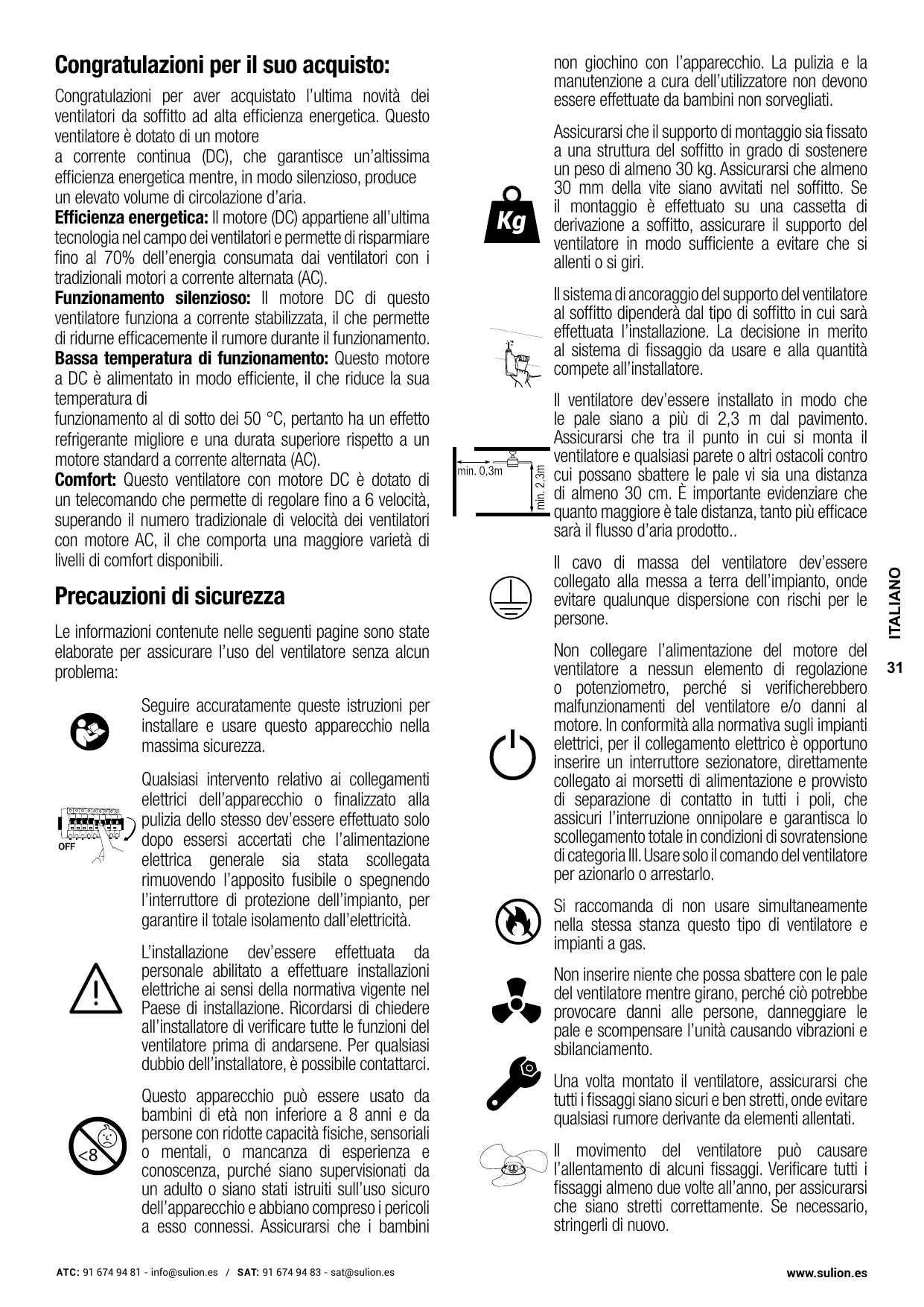 éventuelles réparations ou fourniture de pièces détachées en cas de défaut de fabrication jusqu'à 3 ans à compter de la date de vente. Cette garantie est de 5 ans pour les diodes LED et de 8 ans pour le moteur du ventilateur DC. Sulion n'est pas responsable d'une mauvaise utilisation.