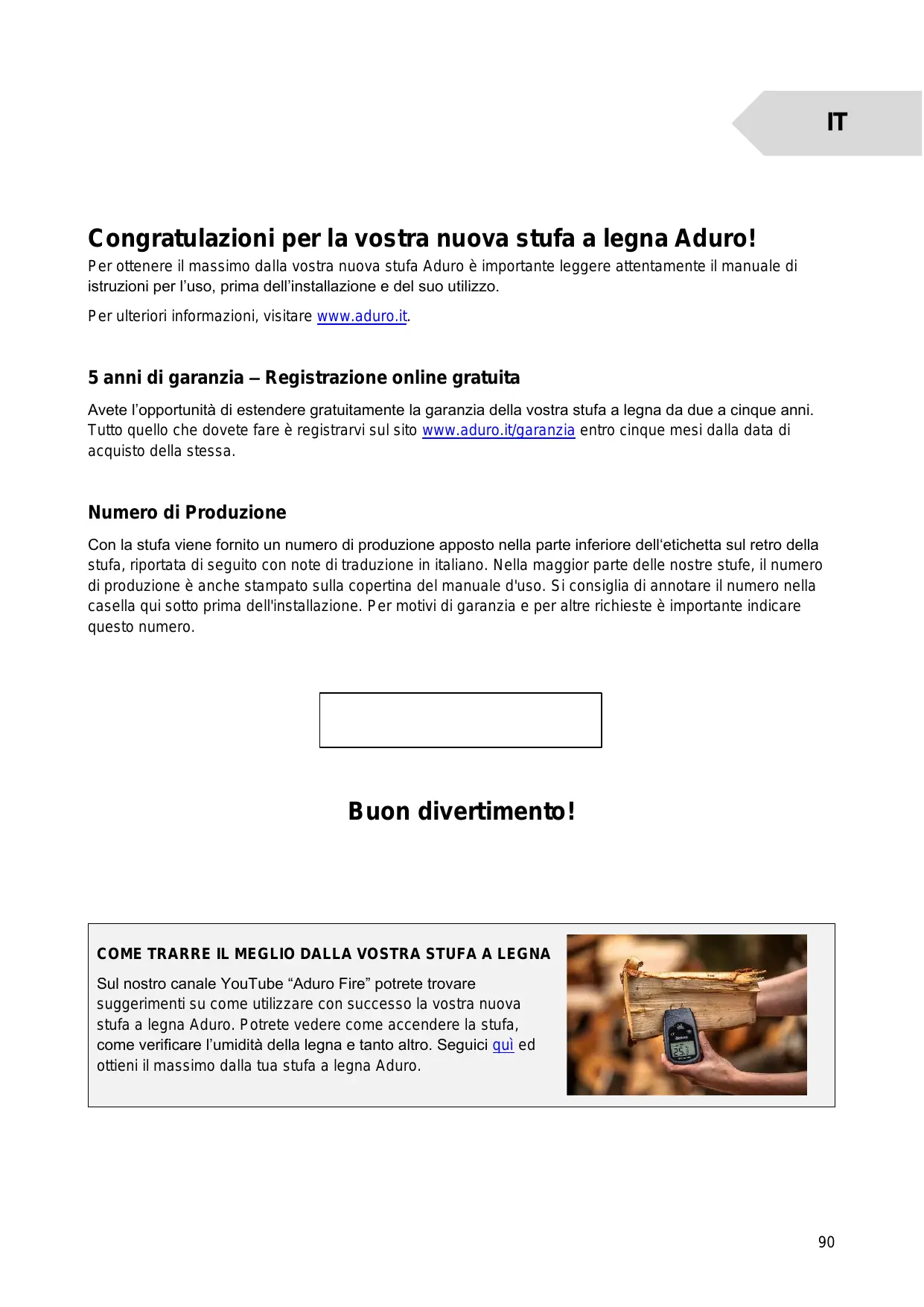 Le numéro de production du poêle se trouve sur la plaque signalétique à l'arrière de l'appareil. Sur la plupart de nos poêles, le numéro de série est également imprimé sur la première page du manuel d'utilisation. Nous vous recommandons d'inscrire ce numéro dans la case ci-dessous. Pour activer la garantie et pour toute autre démarche, vous devez pouvoir fournir ce numéro.