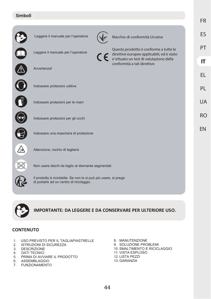 Avvertenzal Indossare protezioni uditive Indossare protezioni per le mani Indossare protezioni per gli occhi Indossare una maschera di protezione Attenzione, rischio di tagliarsi di portario ad un centro di riciclaggio. Non usare dischi da taglio al diamante segmentati Il prodotto à riciclabile. Se non lo si puè più usare, Marchio di conformità Ucraina Questo prodotto à conforme a tutte le direttive europee applicabili, ed à stato e’ettuato un test di valutazione della conformità a tali direttive. si prega Co IMPORTANTE: DA LEGGERE E DA CONSERVARE PER ULTERIORE USO. CONTENUTO