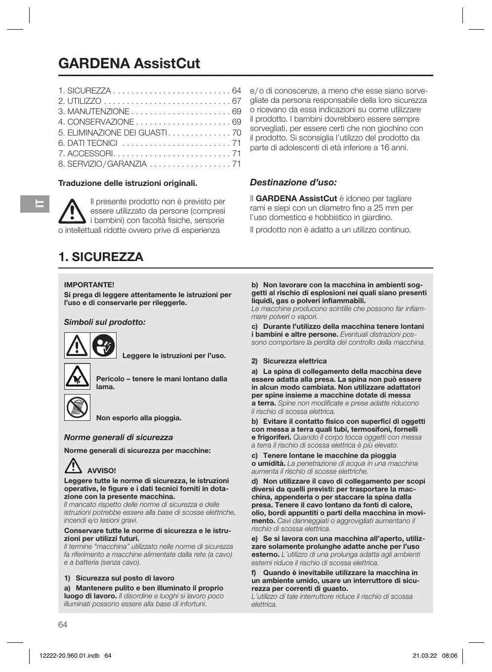 Scarica le istruzioni per il tuo Forbici elettriche in formato PDF gratuitamente! Trova il tuo manuale 12222 - GARDENA e riprendi in mano il tuo dispositivo elettronico. In questa pagina sono pubblicati tutti i documenti necessari per l'utilizzo del tuo dispositivo. 12222 del marchio GARDENA.