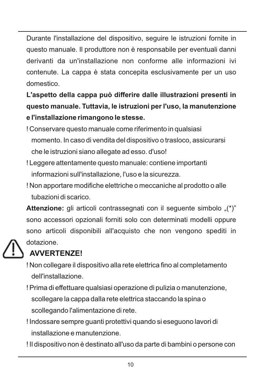 Durante l'installazione del dispositivo, seguire le istruzioni fornite in questo manuale. || produttore non è responsabile per eventuali danni derivanti da un'installazione non conforme alle informazioni ivi contenute. La cappa è stata concepita esclusivamente per un uso domestico.