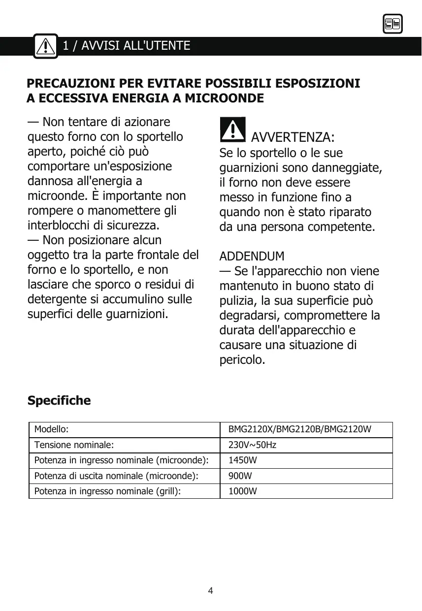 Potenza in ingresso nominale (microonde): 1450W Potenza di uscita nominale (microonde): 900W Potenza in ingresso nominale (grill): 1000W E ISTRUZIONI DI SICUREZZA IMPORTANTI A AVVERTENZA Per ridurre il rischio di incendi, scosse elettriche, lesioni alle persone o esposizione a un'eccessiva energia del forno a microonde durante l'utilizzo dell'apparecchio, seguire le precauzioni di base, comprese le seguenti: