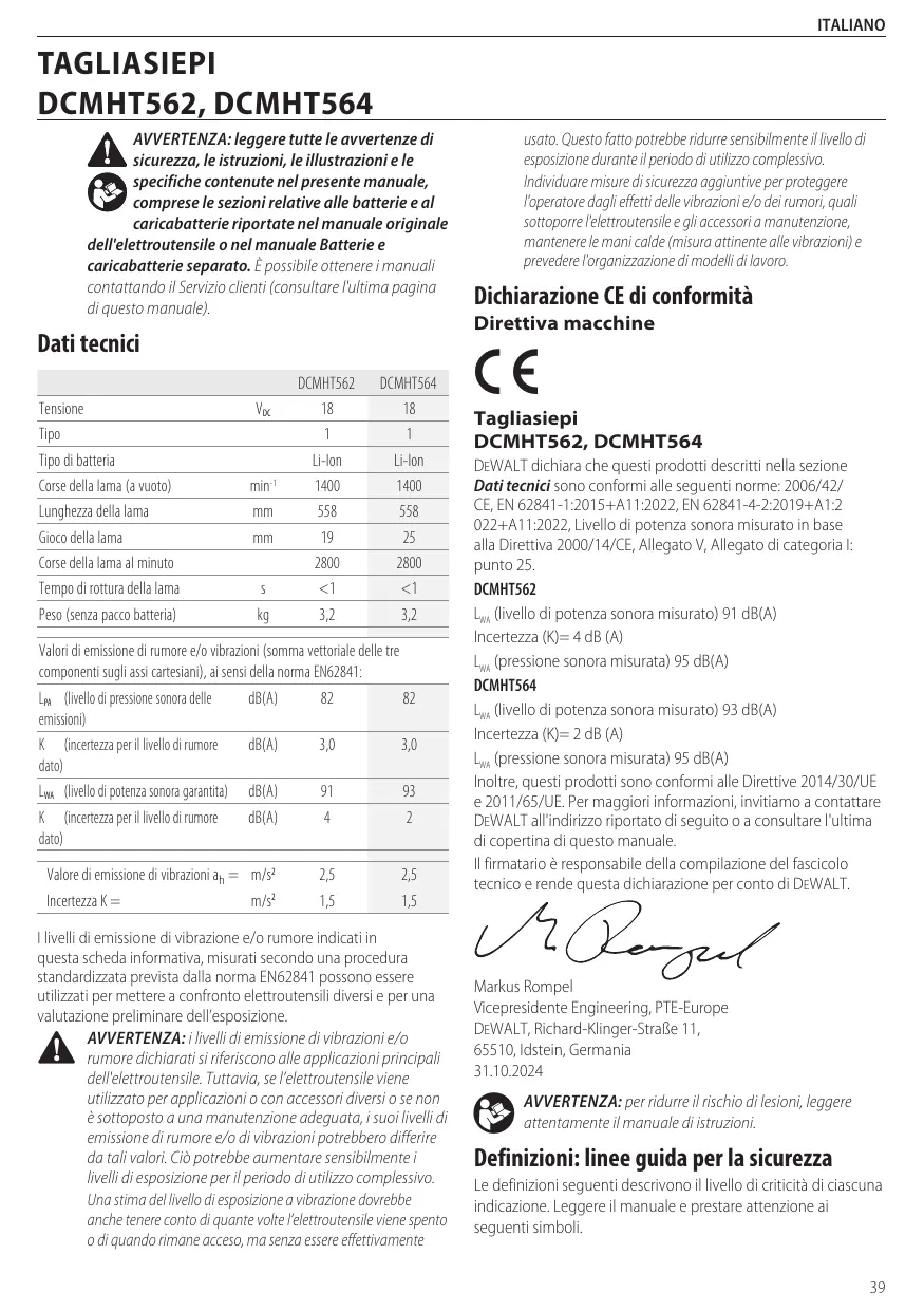 DCMHT562 - DCMHT564 - Tagliasiepi DEWALT - Manuale utente e istruzioni gratuiti