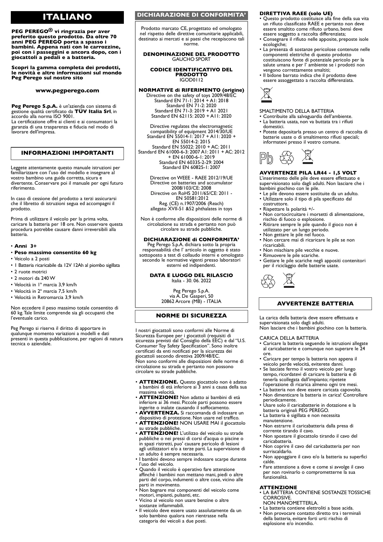 Scarica le istruzioni per il tuo TOUT TERRAIN in formato PDF gratuitamente! Trova il tuo manuale Gaucho Sport - PEG PEREGO e riprendi in mano il tuo dispositivo elettronico. In questa pagina sono pubblicati tutti i documenti necessari per l'utilizzo del tuo dispositivo. Gaucho Sport del marchio PEG PEREGO.